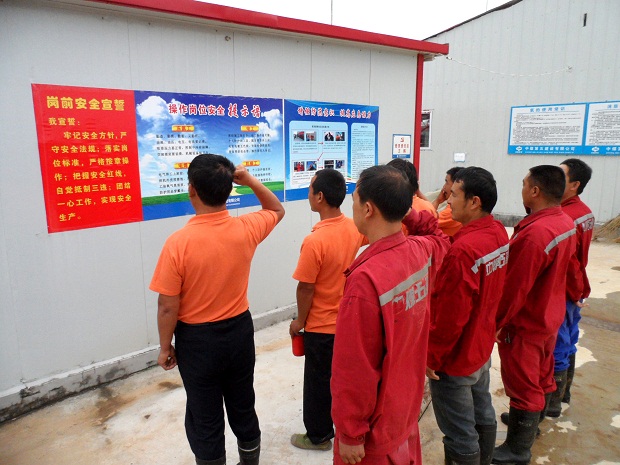 每天上岗前,各工种职工都会聚集在冻结车间门口,开展岗前安全宣誓活动。岗前宣誓作为项目部班组交接班工作的重要内容,是接班员工必须履行的工作程序。它不仅仅是一种形式,而且是对安全工作的一种提示,对安全责任的一种提示,通过这种必要的、有效的形式来推动和促进项目部安全生产。