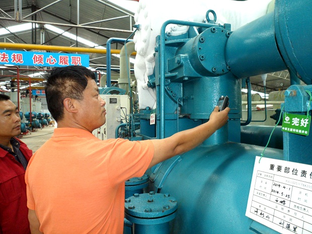 班组进行安全隐患排查,班长正在检测灭火器压力是否达标